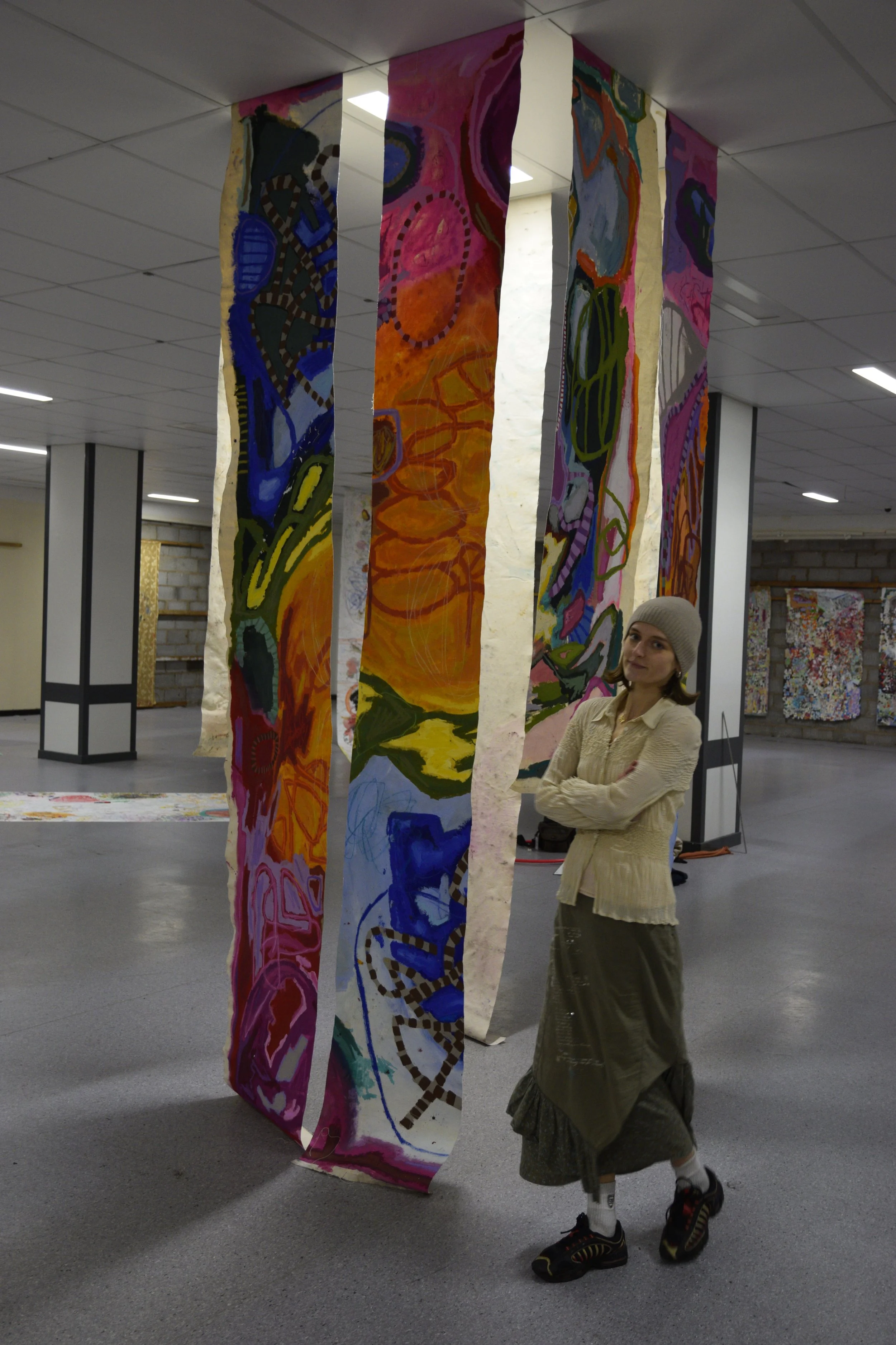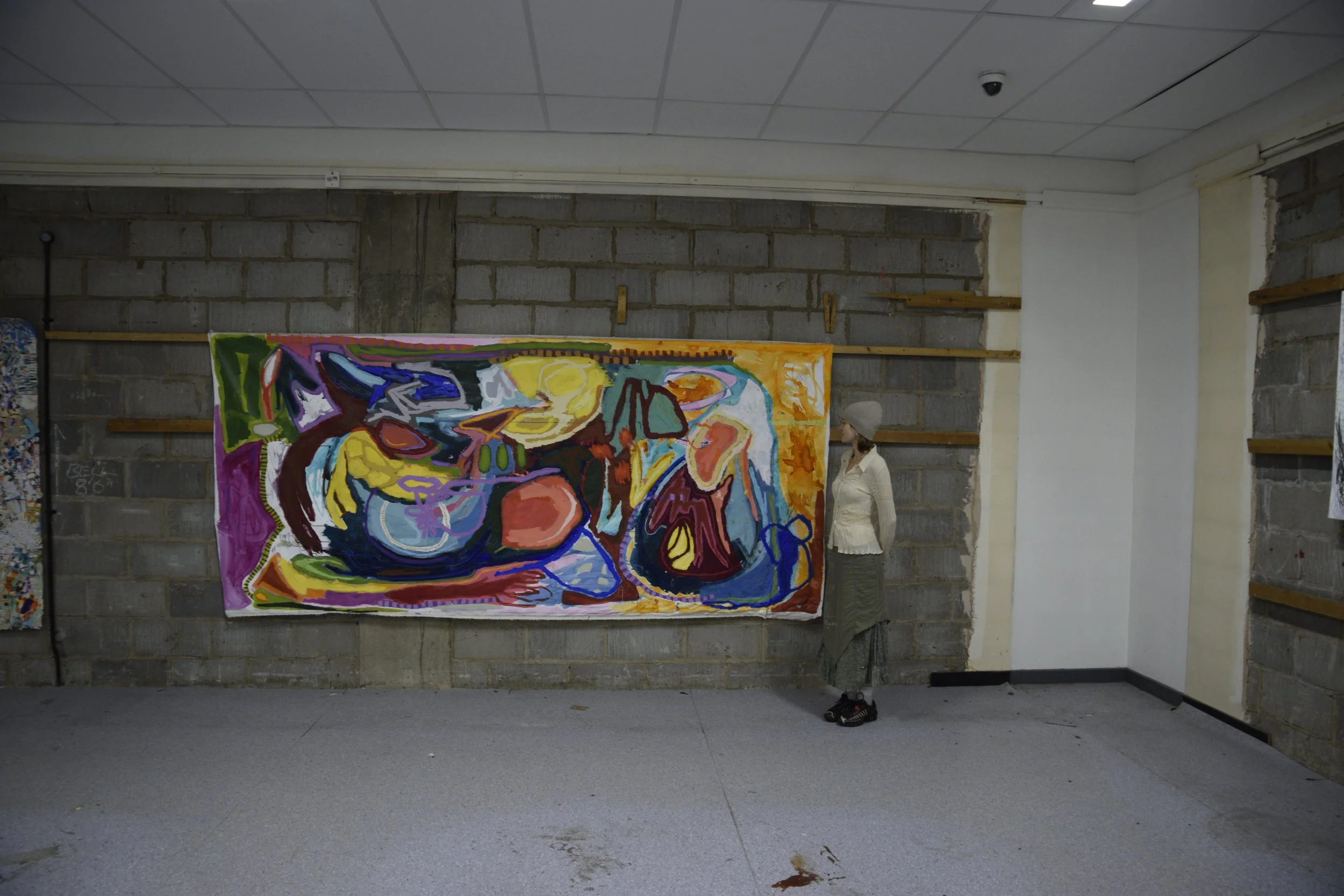 Grace is often working on multiple pieces at once, allowing ideas to flow from one artwork to the next. This approach feels most natural to her. The often overwhelming compositions in her work are an outward projection of her mind. Leaving space for interpretation is crucial to Grace; she wants her works to be experienced and digested in diverse ways. She enjoys seeing how her audience perceives her work, finding themselves within the chaos of her style.