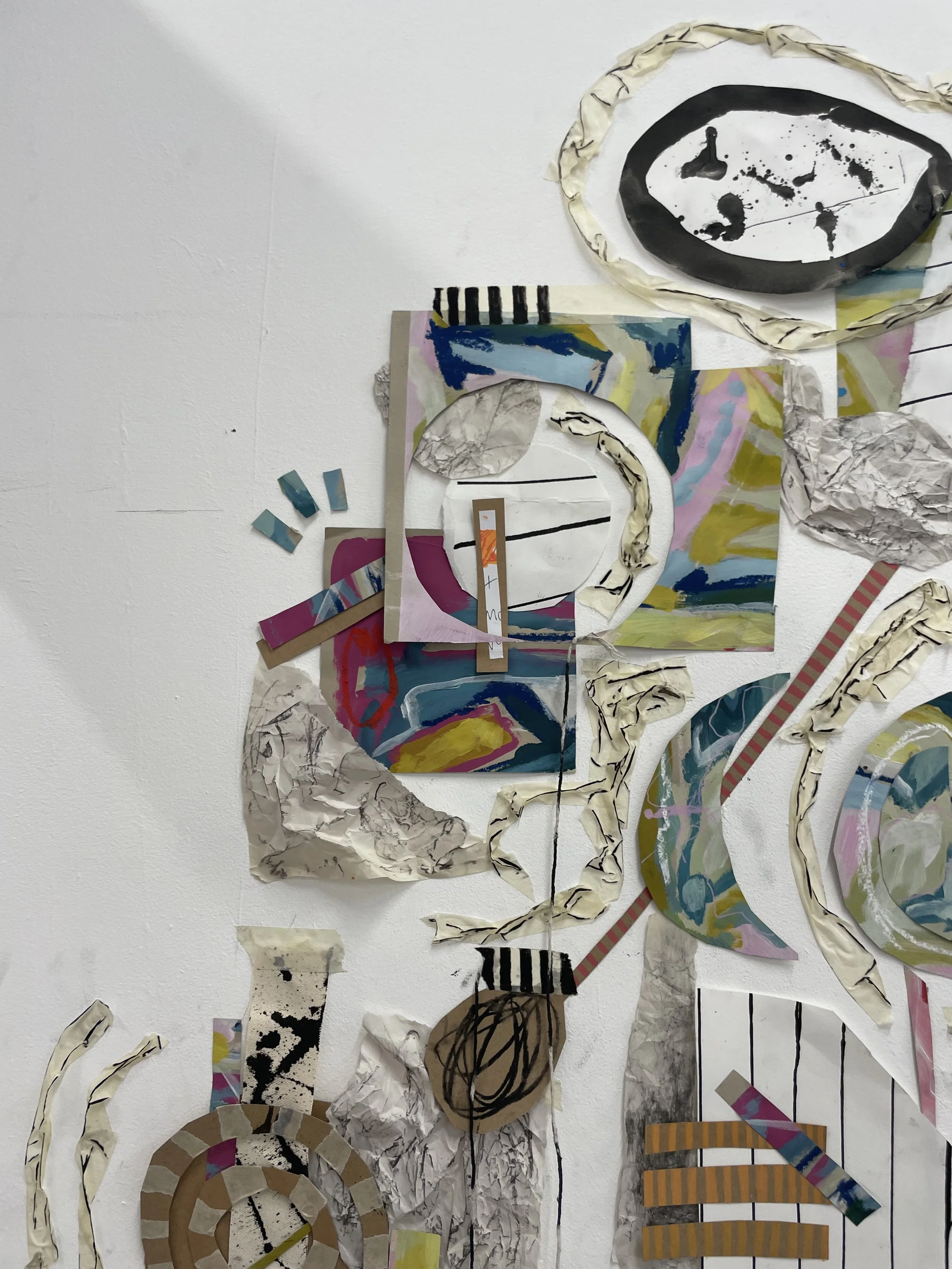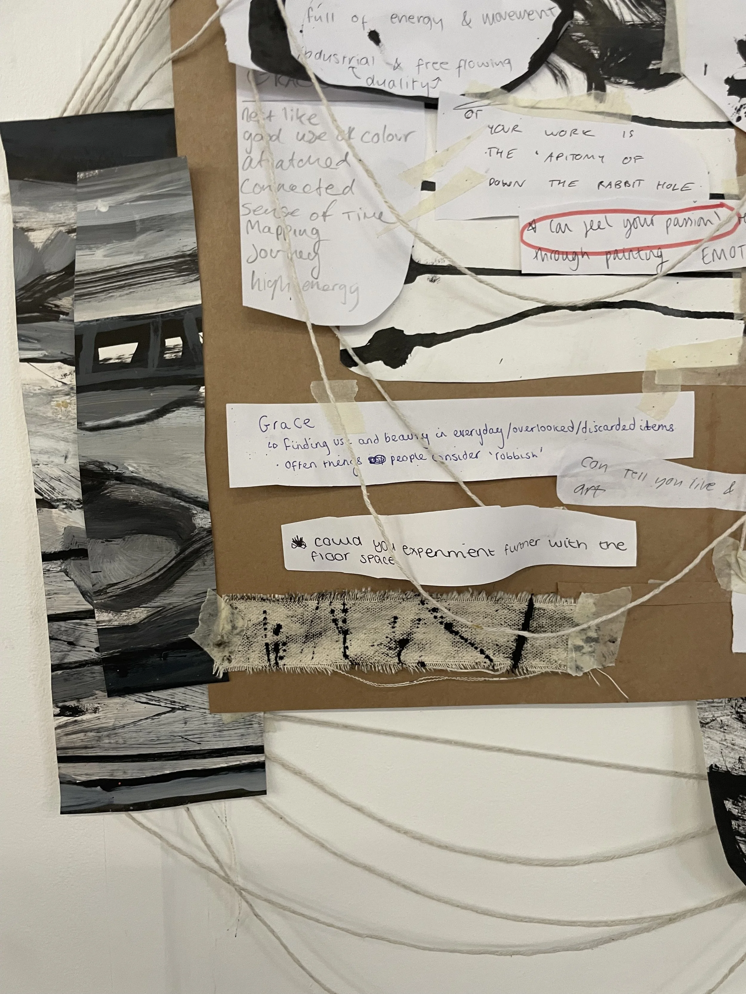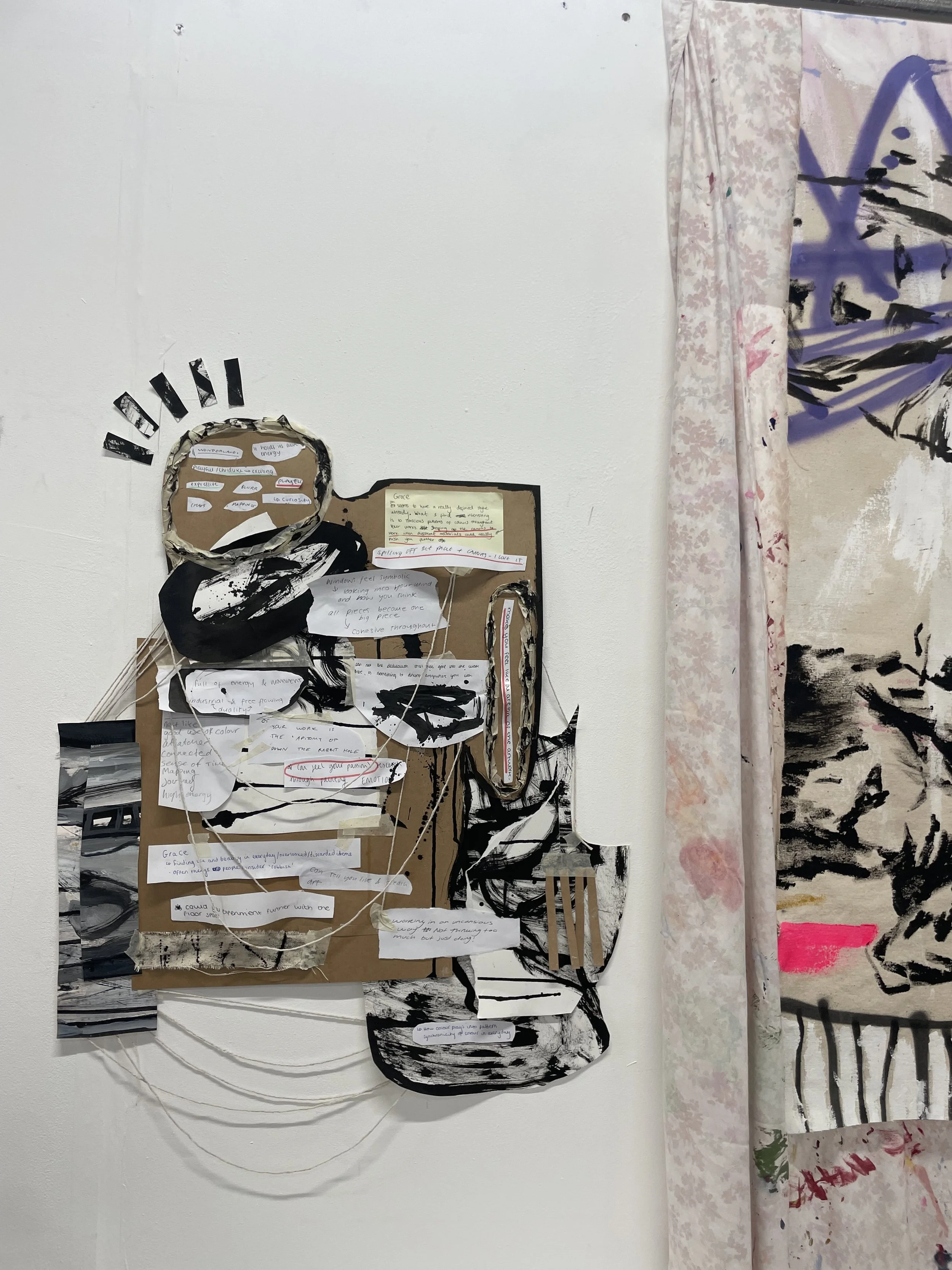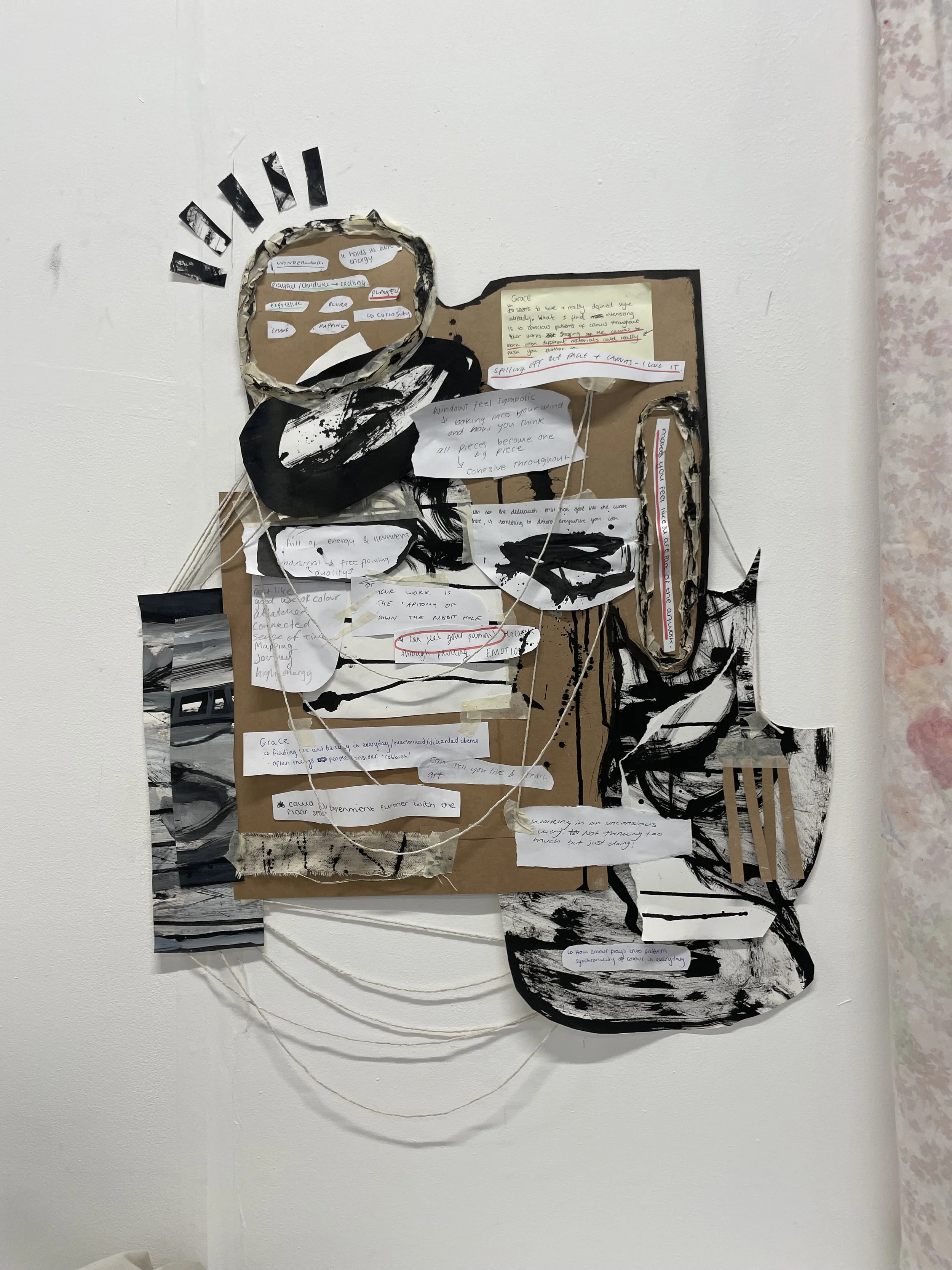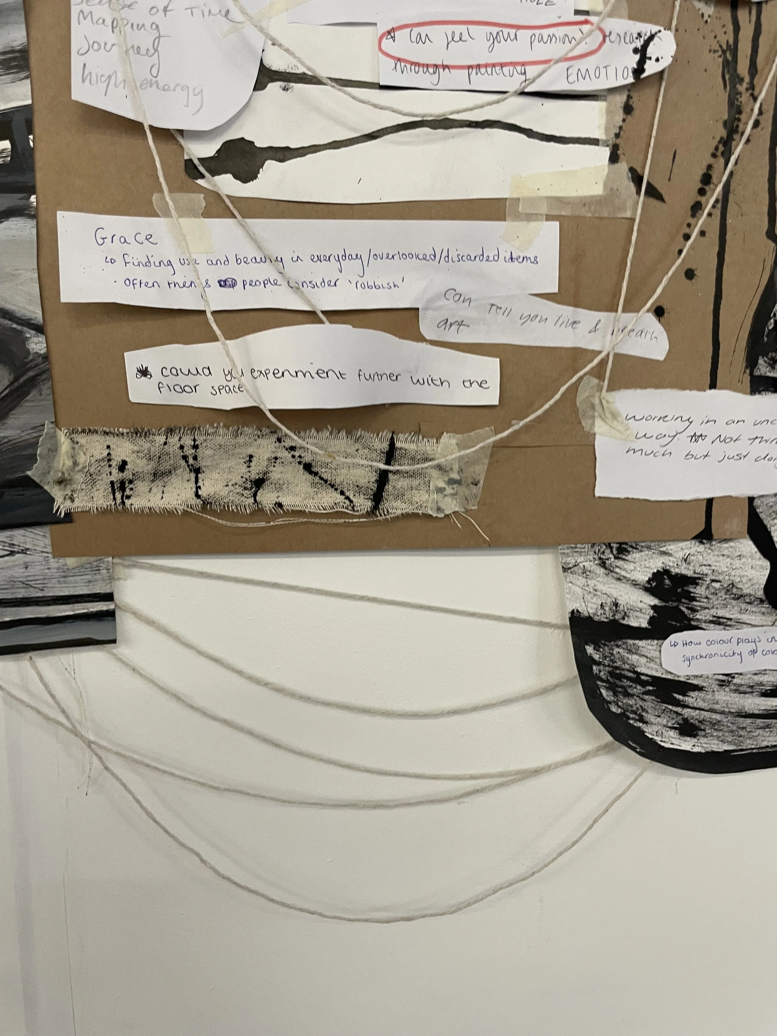 This work emerged as a response to crit feedback around the nature of my studio space its energy, its restlessness, its continual state of becoming. I wanted to push this further, allowing the mark to exist beyond the surface, to physically occupy space.