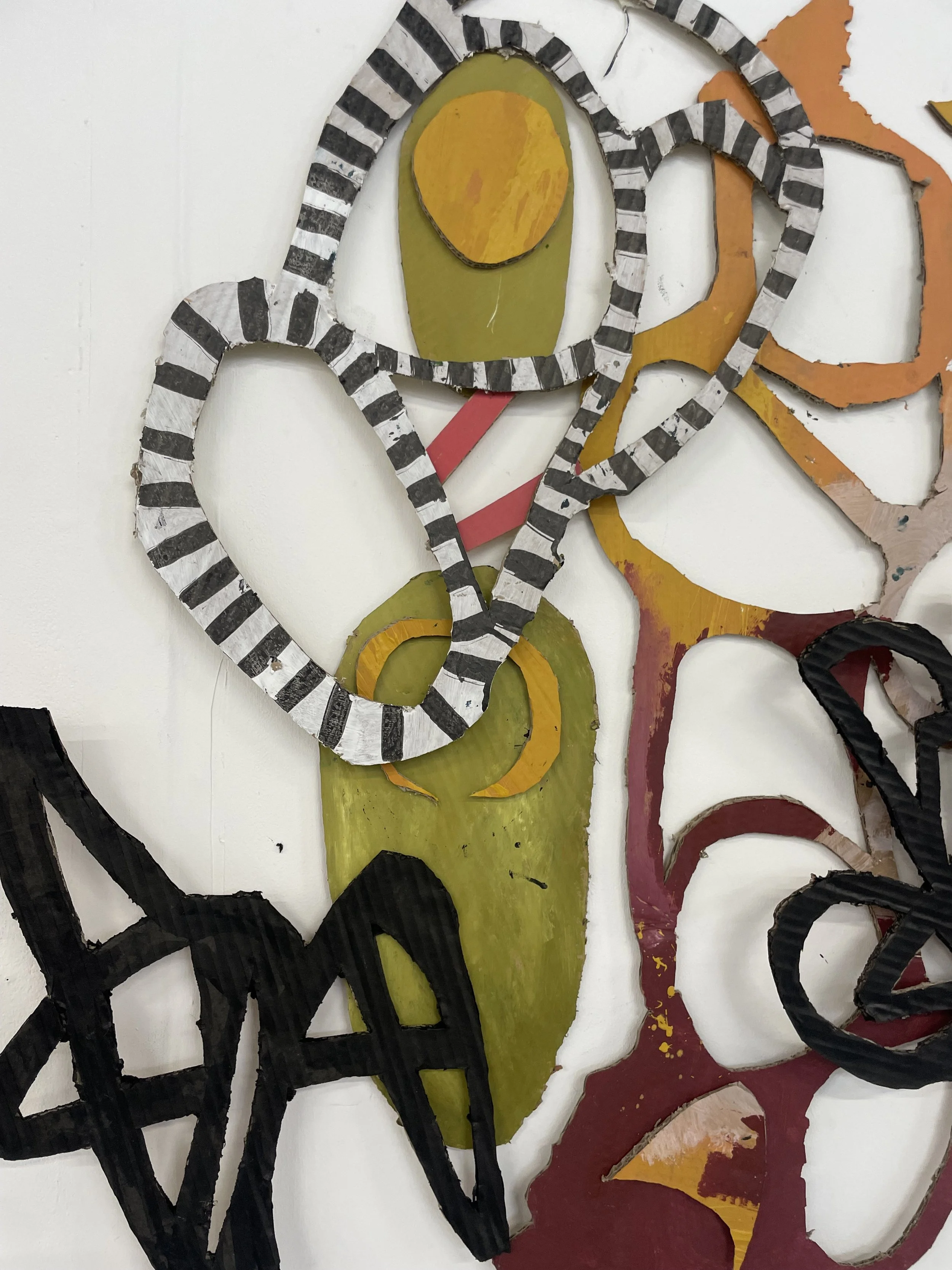 Working intuitively, I move between painting, sculpture, and installation, allowing marks to evolve beyond their traditional boundaries. The forms echo the spontaneity of handwriting or bodily movement, yet they exist as solid structures — suspended between the act of making and the permanence of objecthood.