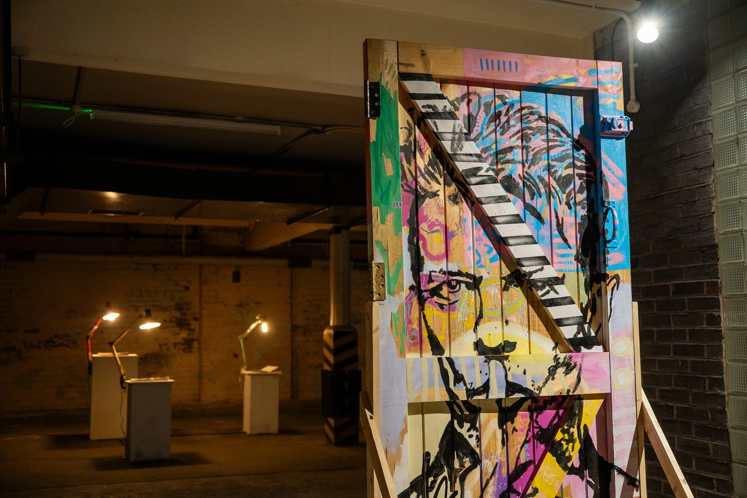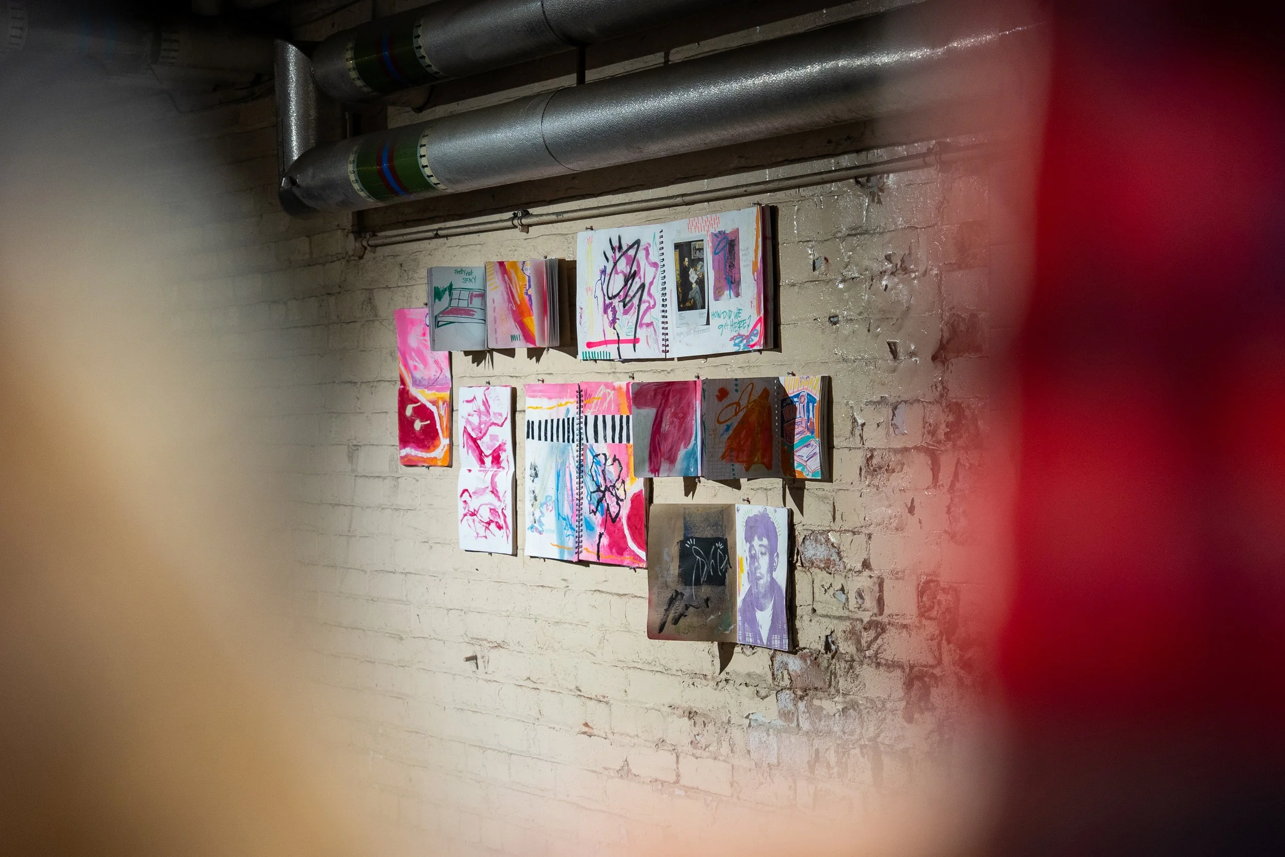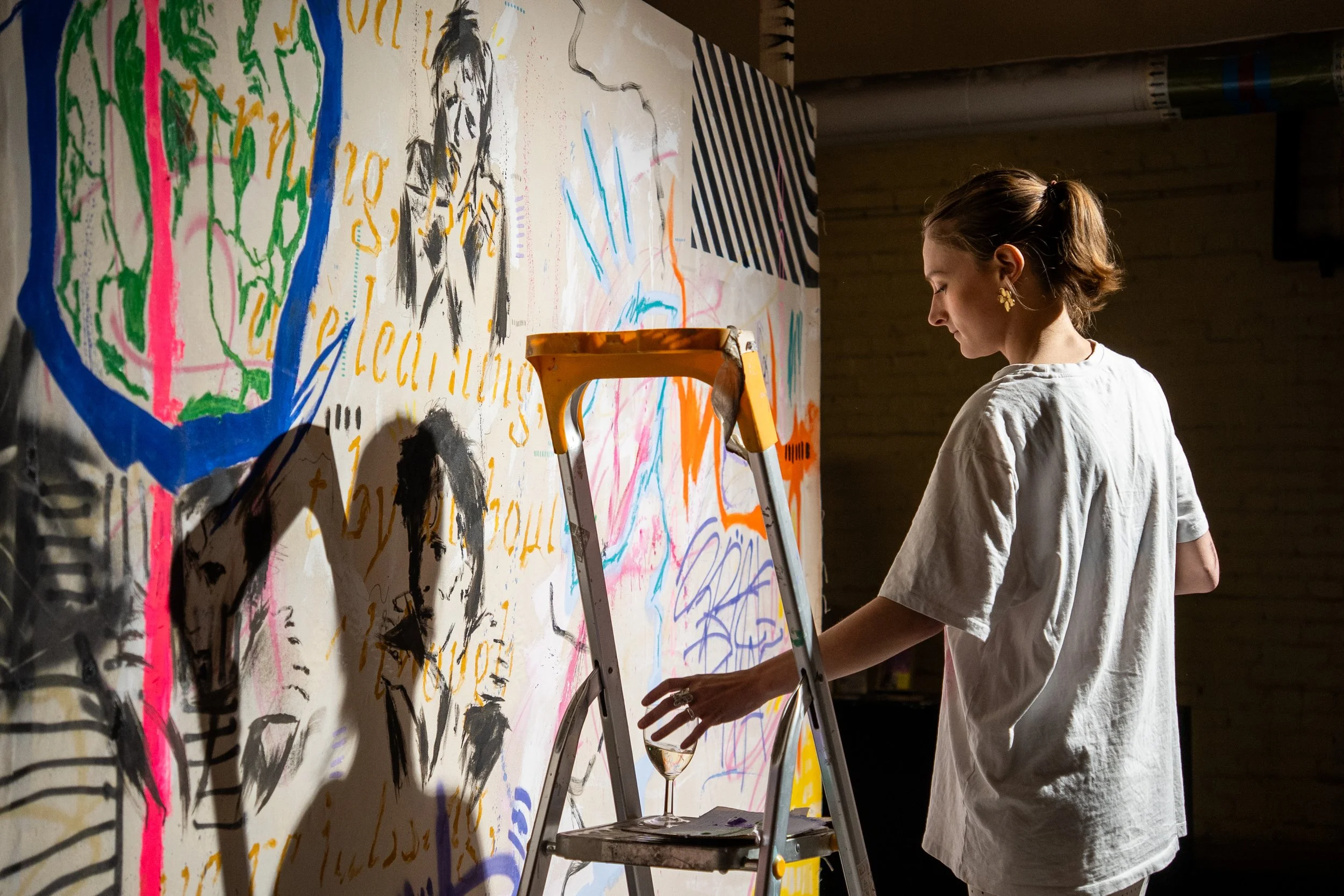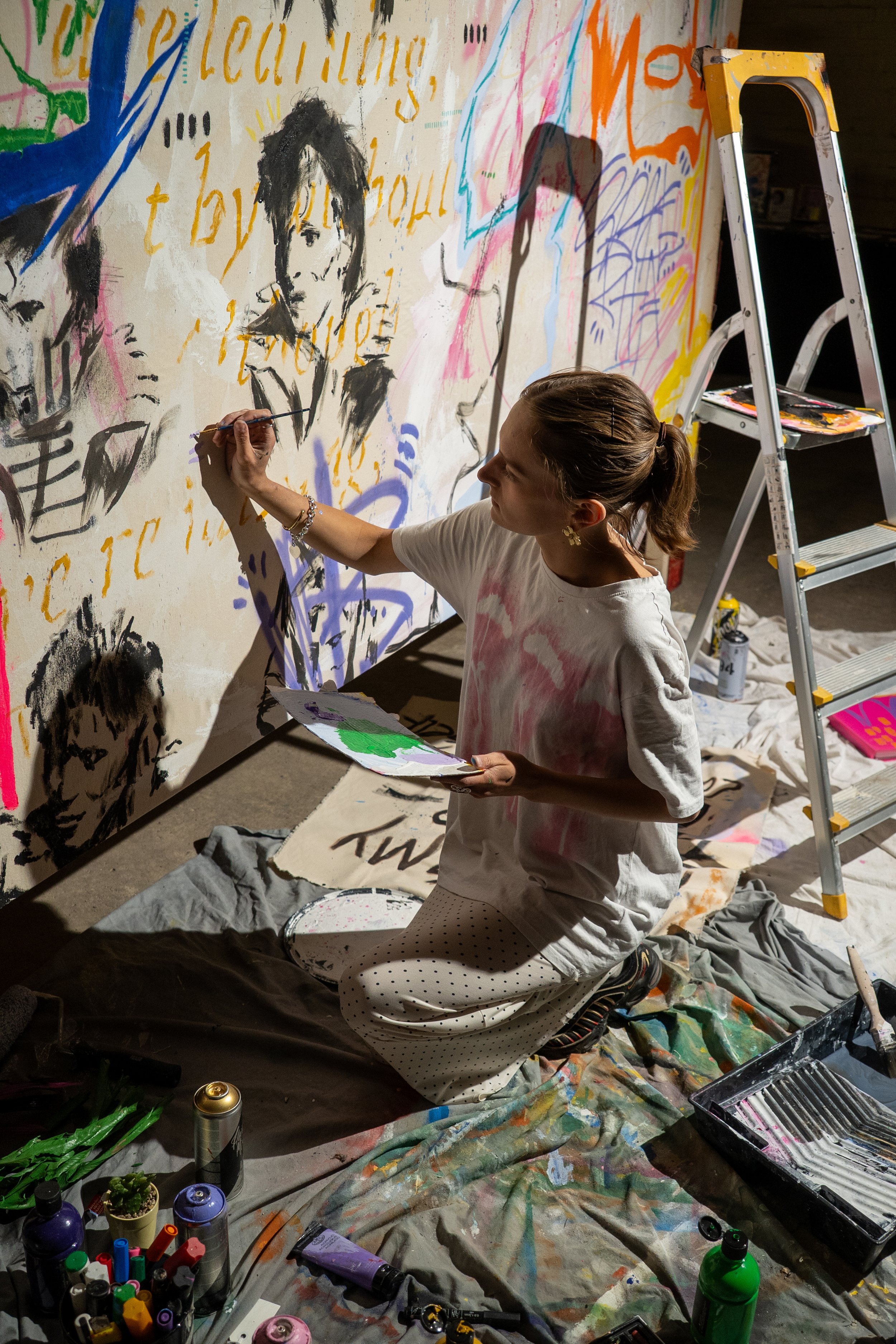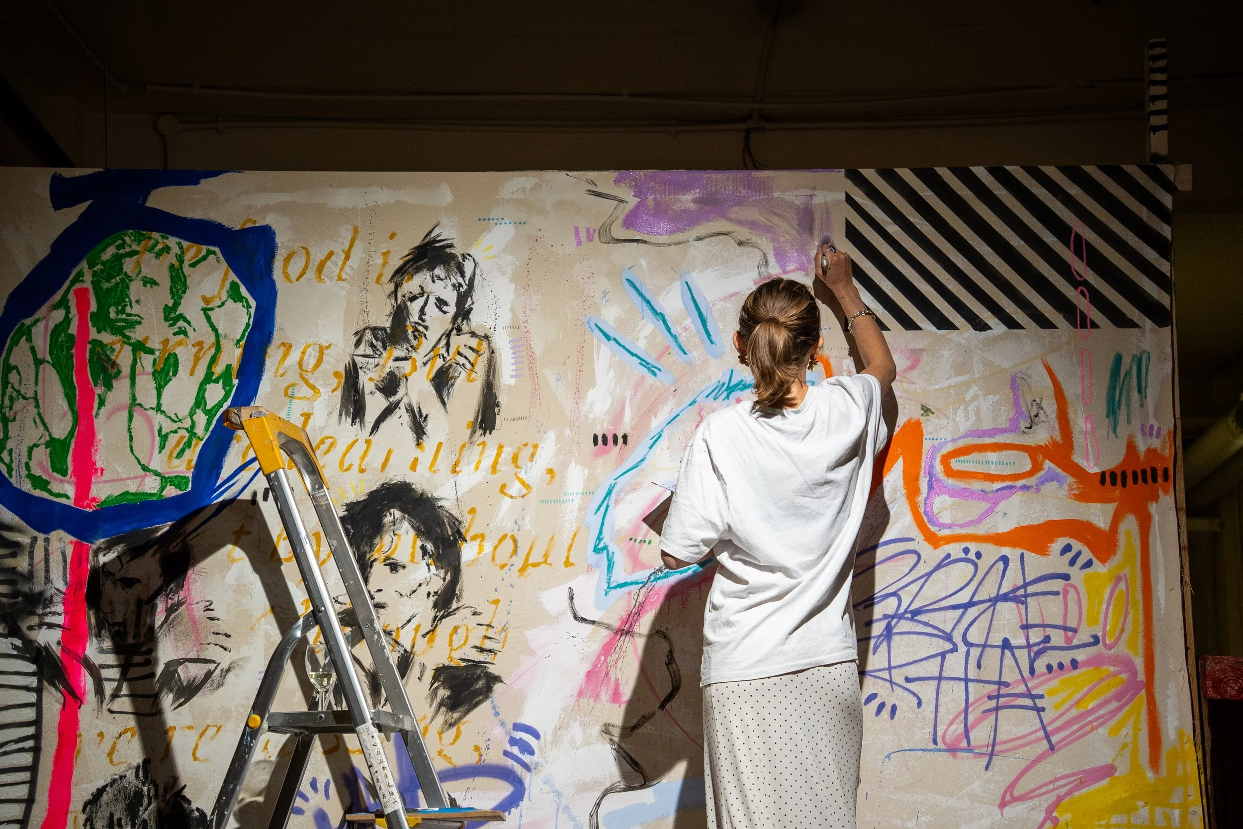 Large-scale wall works combined gestural mark-making, figurative fragments, text, and bold colour interventions, creating layered compositions that spoke to both instinct and intentionality. The performative act of painting — live, in the space — became central, allowing process to remain visible and open-ended rather than concealed in a polished final product. This openness invited viewers to consider art-making not as a static outcome but as an evolving dialogue between material, gesture, and environment.