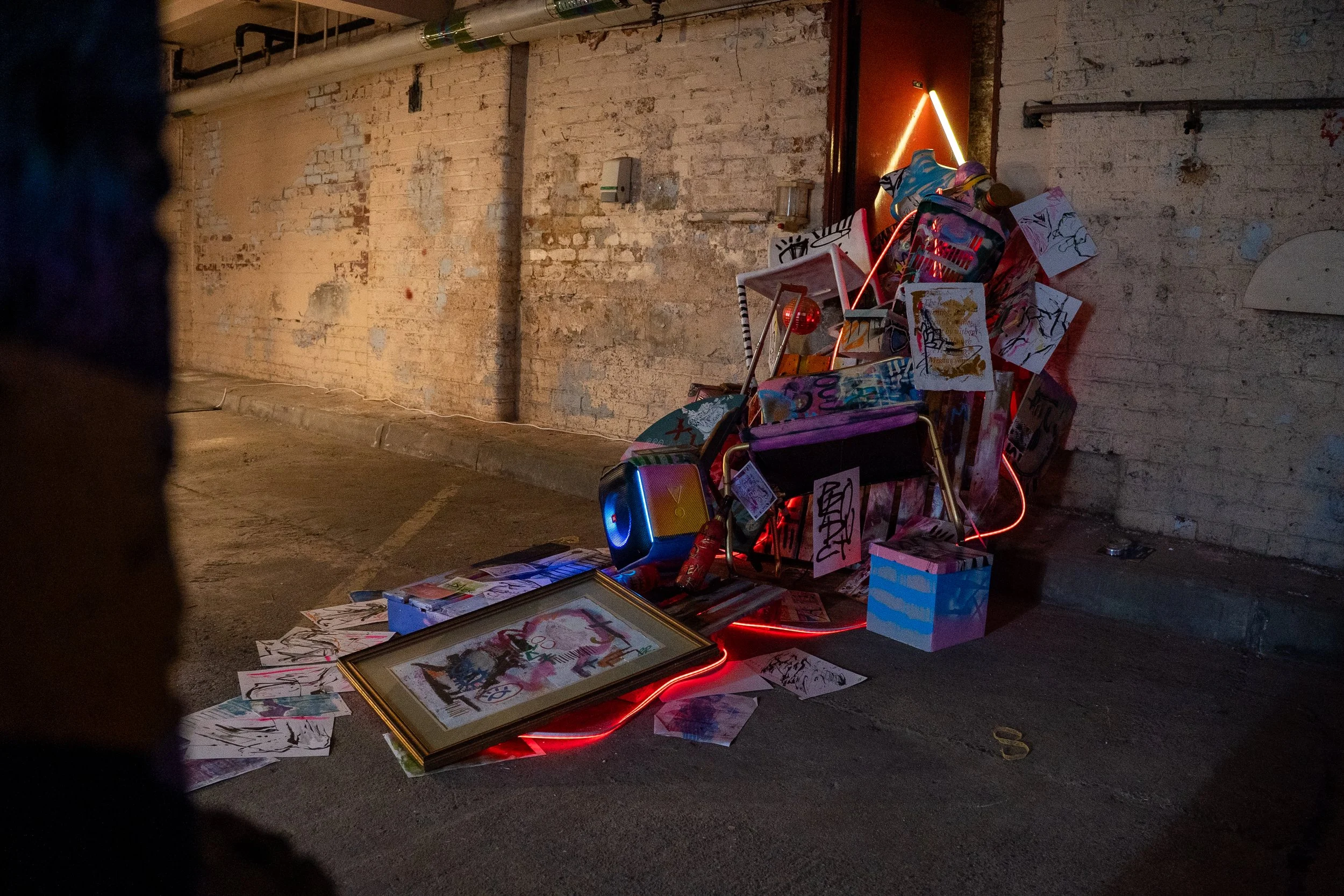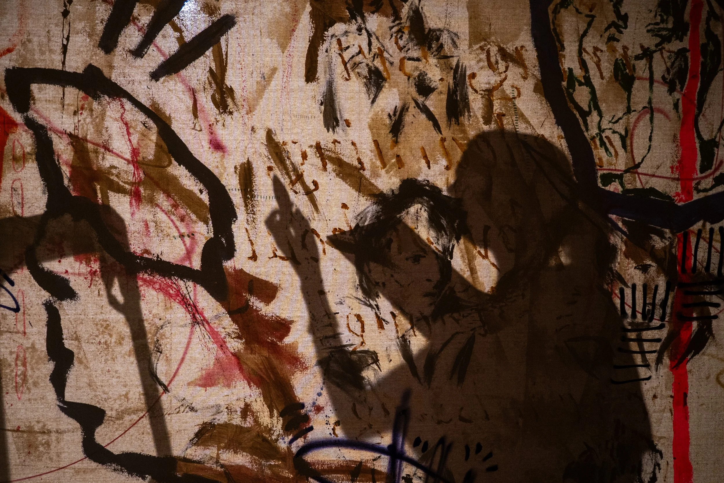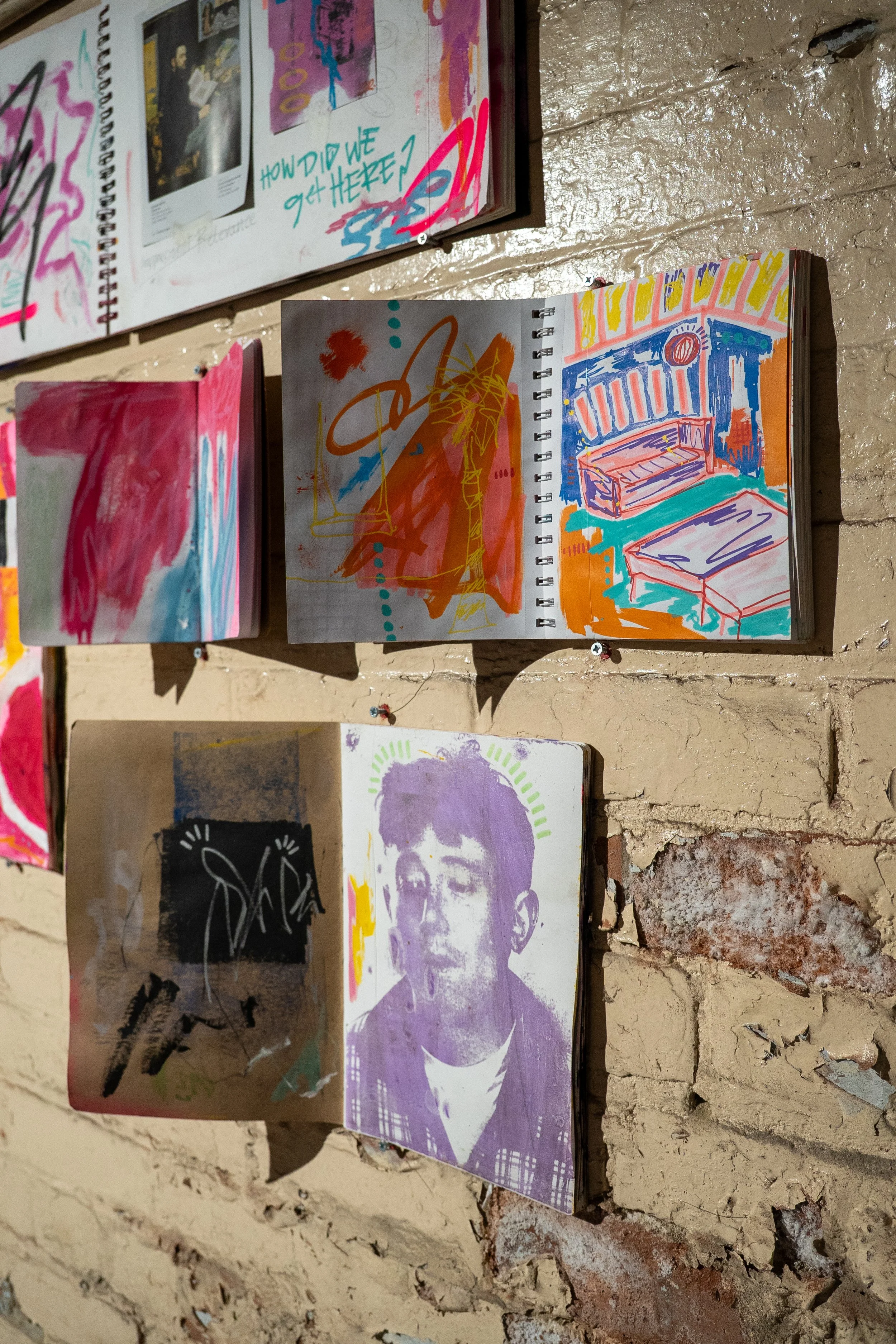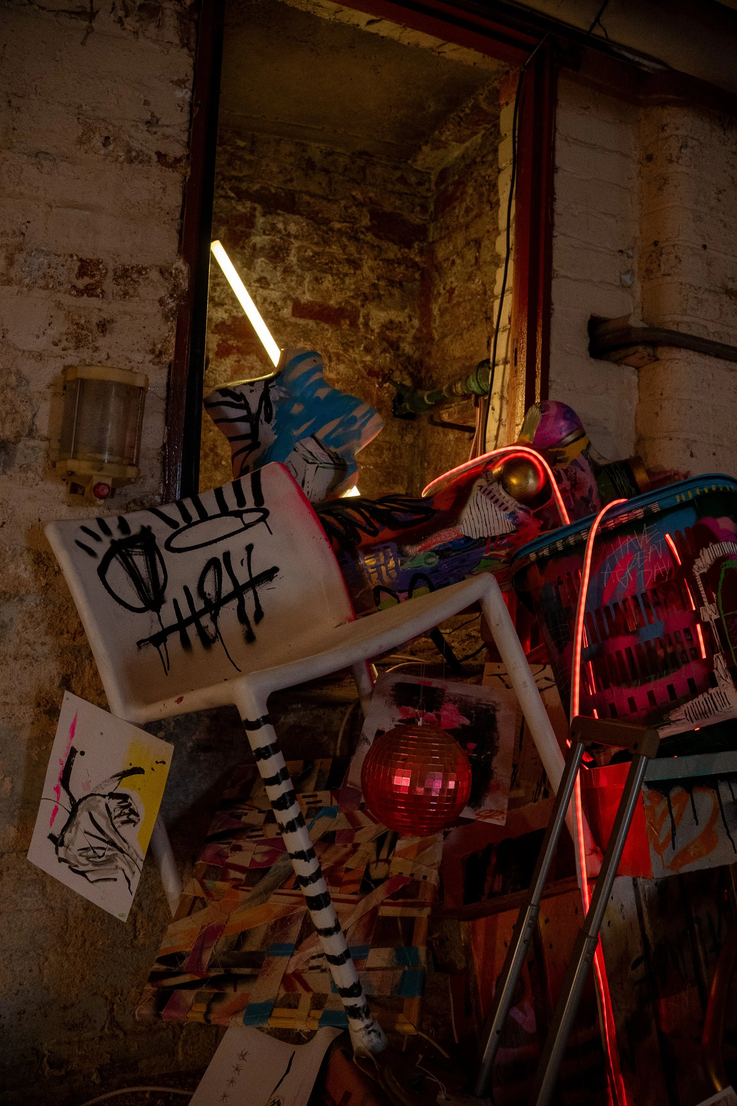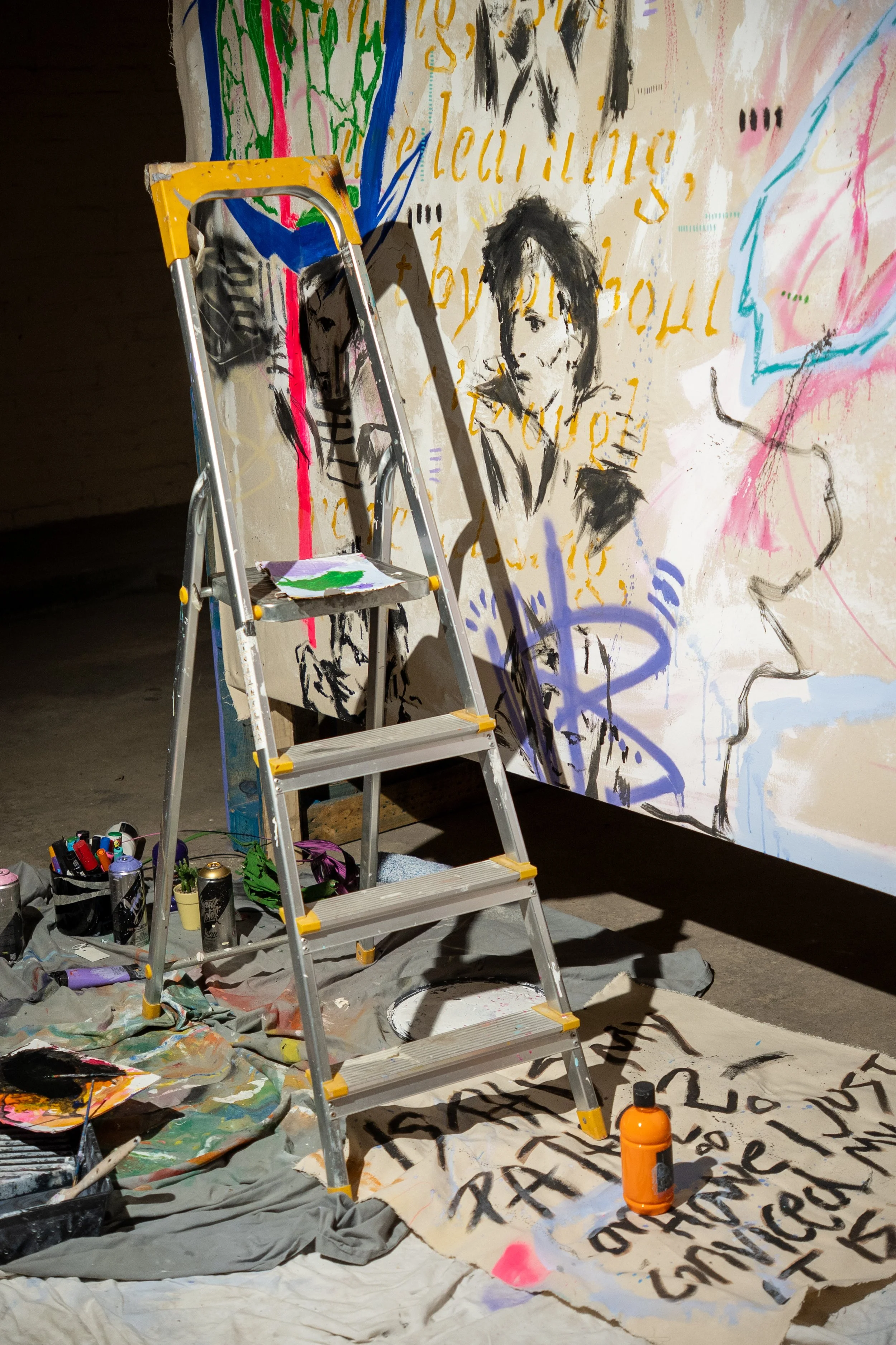Large-scale wall works combined gestural mark-making, figurative fragments, text, and bold colour interventions, creating layered compositions that spoke to both instinct and intentionality. The performative act of painting — live, in the space — became central, allowing process to remain visible and open-ended rather than concealed in a polished final product. This openness invited viewers to consider art-making not as a static outcome but as an evolving dialogue between material, gesture, and environment.