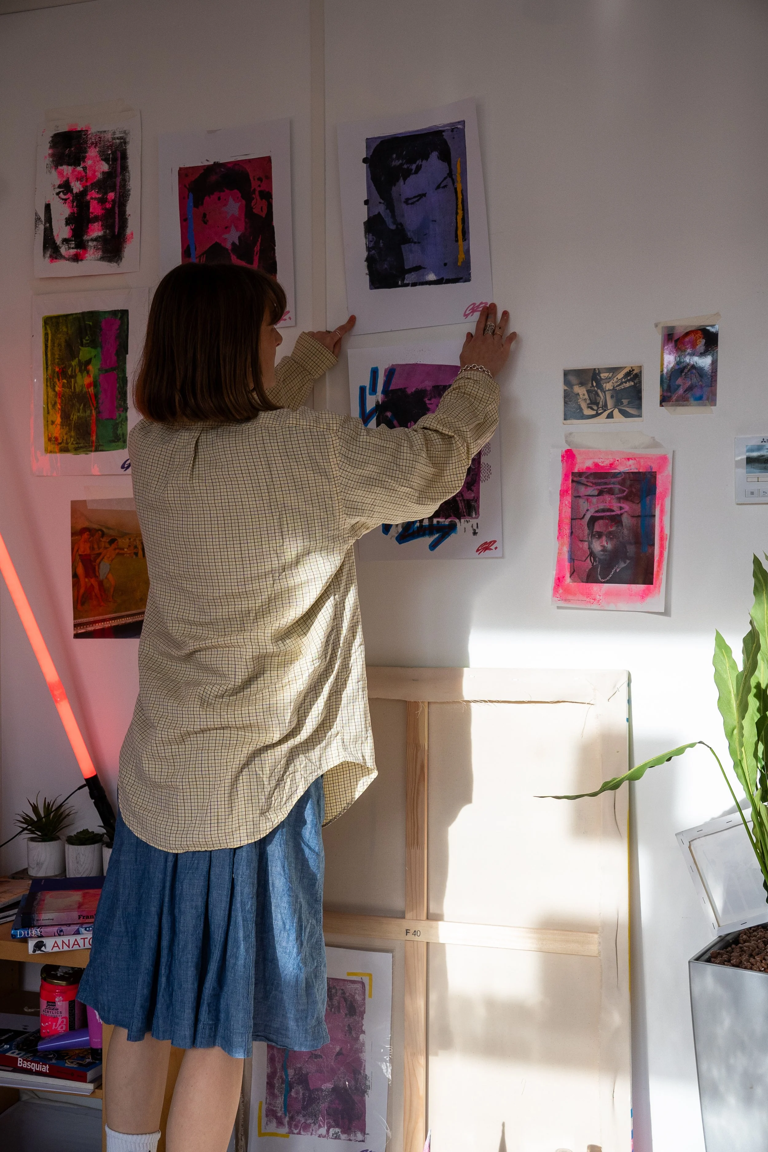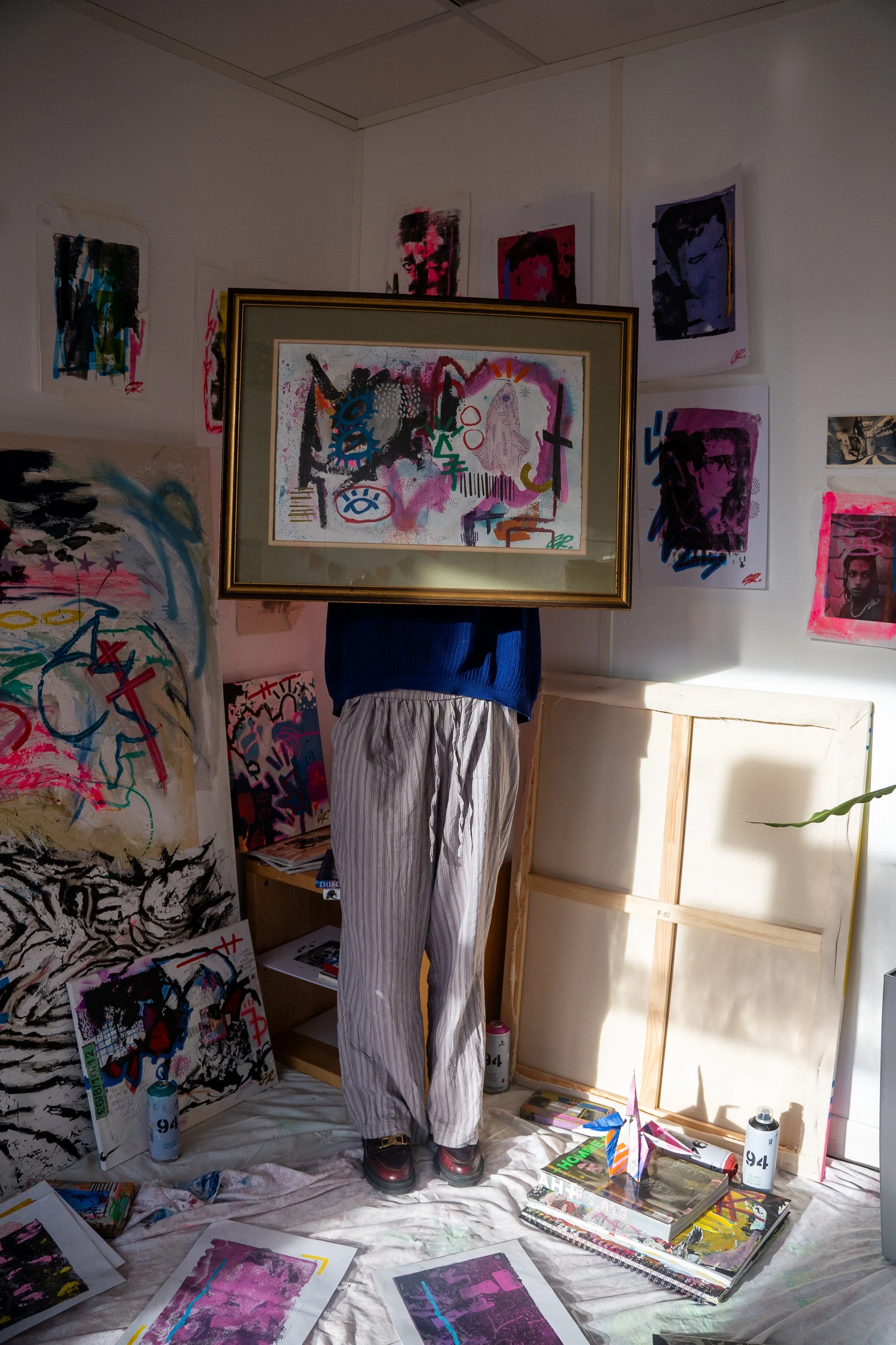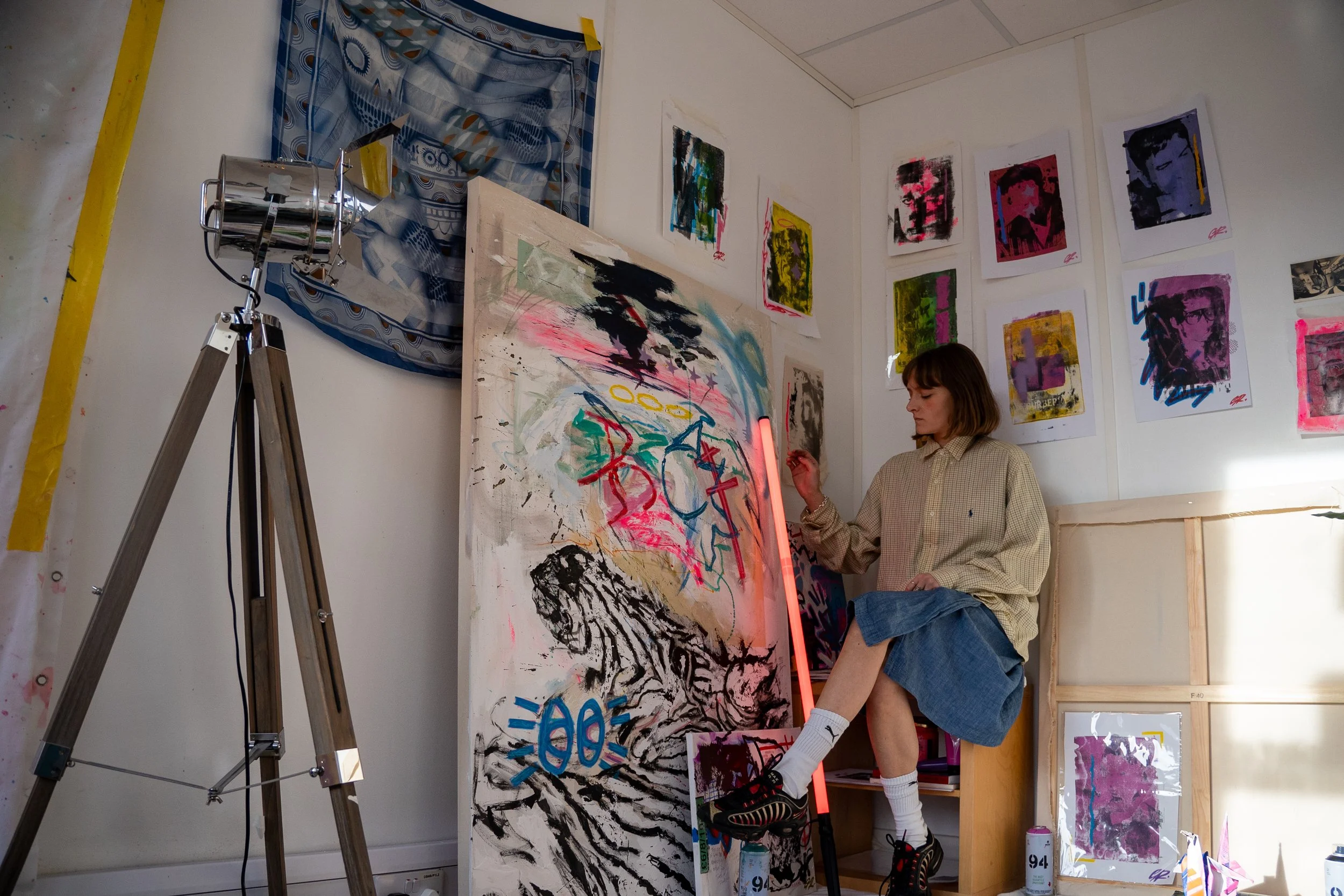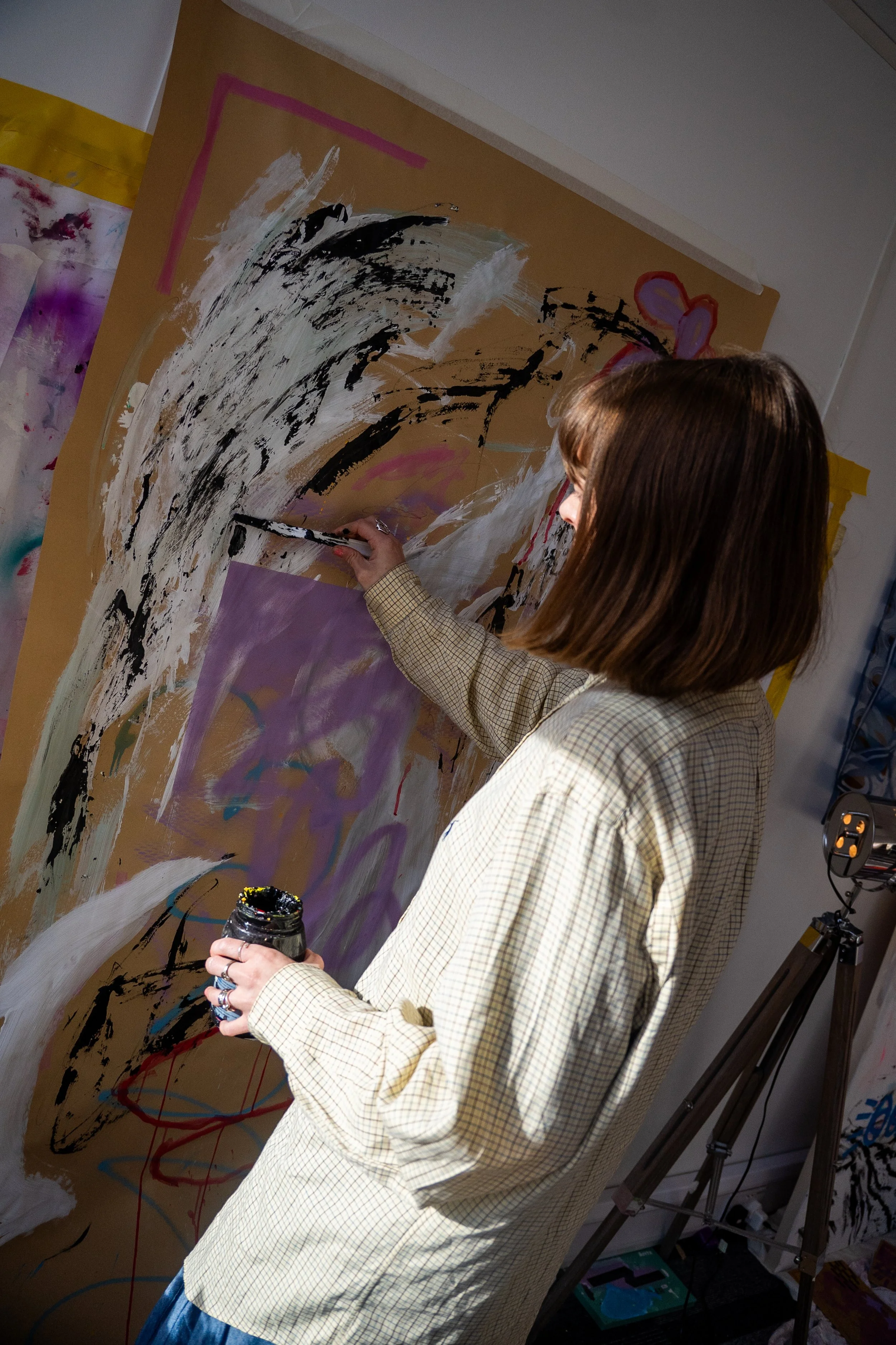 This study shoot is an intimate documentation of the act of painting—an exploration of movement, materiality, and the dialogue between artist and surface. The photographs capture the dynamic tension between control and spontaneity, as bold gestures of paint collide with structured mark-making.